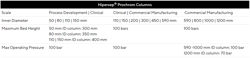 Hipersep® Prochrom HPLC Columns are designed for process development and manufacturing. They are available from 50 mm to 1200 mm ID. Similar design throughout the range ensures true linear scale-up of column performance, simplifying scale-up without requiring any method redevelopment.