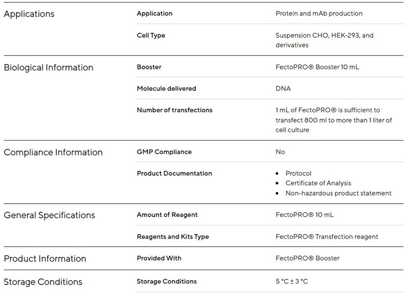 FectoPRO® Transfection reagent is specifically designed for enhanced Transient Gene Expression (TGE) in suspension CHO and HEK-293 cells in various serum-free media, using low DNA amount (< 1 µg/ml of cell culture).