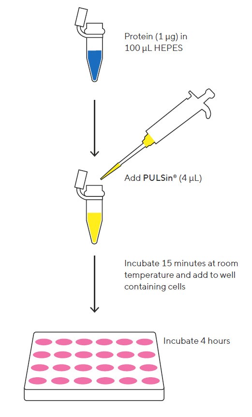 PULSin® saves time and effort compared to techniques like viral transduction or chemical conjugation. The reagent is ready-to-use and comes with a dilution buffer and a fluorescent control protein (R-phycoerythrin).
