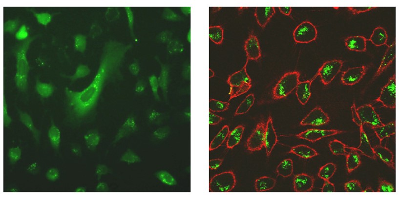 Antibodies are successfully delivered into mammalian cells and can recognize their target protein within the cytoplasm. PULSin® enabled the delivery of FITC-labeled anti-alpha-tubulin into the cytoplasm of 85% of HeLa cells. Similarly, anti-giantin labeled with Alexa Fluor® 488 was delivered to 98% of live HeLa cells, labeling the Golgi apparatus.
