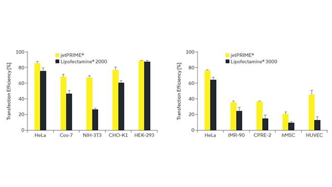 Transfekcija z jetPRIME® zahteva majhne količine reagenta in nukleinskih kislin, kar povečuje življenjsko sposobnost celic ob ohranjanju visoke učinkovitosti transfekcije.