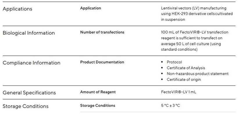 Lentivirusni vektorji so prepoznani kot vektor izbire za alogenske ali avtologne celične terapije (kot je CAR-T) zaradi svoje sposobnosti trajne integracije virusnega genoma v DNK gostiteljske celice. Za proizvodnjo teh vektorjev proizvajalci običajno uporabljajo sistem prehodne transfekcije, ki se postopno povečuje skozi razvojne faze procesa. FectoVIR®-LV je zasnovan za proizvodnjo v velikem merilu z zmanjšanim volumnom kompleksacije in izboljšano stabilnostjo kompleksov. Prednosti FectoVIR®-LV omogočajo večje število proizvedenih doz na serijo za zdravljenje več pacientov ter zmanjšanje stroškov proizvodnje lentivirusov.