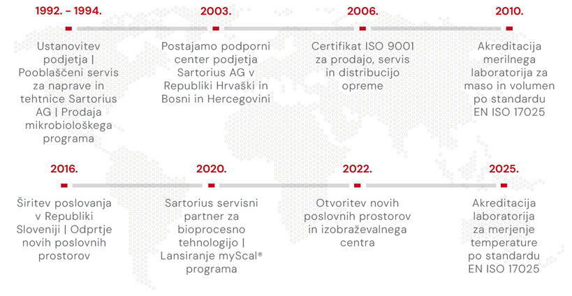 Z nenehnim delom so našo vizijo prepoznale stranke, ki so nam zaupale in se prepričale o naši kakovosti. Kmalu po ustanovitvi, leta 1994, se je ves trud, znanje in kompetence, ki smo jih vložili v našo dejavnost, obrestoval, ko smo postali pooblaščeni servis za naprave in tehtnice Sartorius AG, vodilnega nemškega proizvajalca laboratorijskih izdelkov in bioprocesne tehnologije.