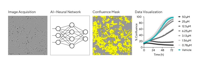 AI-driven confluence analysis provides a simple workflow for highly accurate cell segmentation in phase contrast images, accommodating a wide range of cell types and morphologies with minimal user input. AI confluence analysis is available with Incucyte® v2022A software.