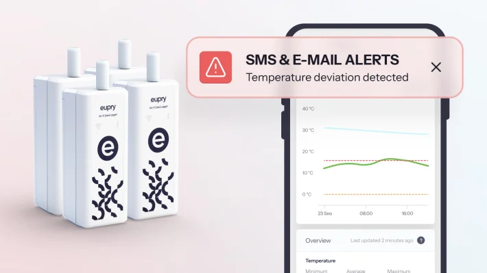 Eupry je nova zmogljiva in preprosta rešitev za beleženje podatkov o temperaturi, vlažnosti, diferenčnem tlaku in ogljikovem dioksidu. Zmanjša čas, potreben za odčitavanje temperature, kot pri običajnih rešitvah za nadzor temperature, in varno shrani vaše podatke. Eupryjev zapisovalnik podatkov je enostaven za namestitev - s spletnim dostopom do programa spremljate okoljske razmere, brezplačna sporočila SMS in e-pošta vas opozorijo na odstopanja, napravo pa lahko upravljate popolnoma brezžično. Eupry je namenjen lekarnam, laboratorijem, živilski in farmacevtski industriji ter hladni verigi, pa tudi široki uporabi, kot so supermarketi, muzeji in skladiščni prostori za umetniška dela, vinske kleti, stavbe in pisarniški prostori.